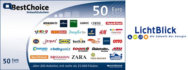 Es sind schon viele Worte gefallen, daher möchten wir jetzt wie vor einem Monat zugesagt Taten sprechen lassen: Wir schenken LichtBlick-Kunden, die über HGWG zu uns gekommen sind und denen HGWG noch Coins oder Gutscheine schuldet, einmalig einen Best Choice Gutschein im Wert von 50 Euro. Der Gutschein kann von Euch bei über 200 Anbietern eingelöst werden. Selbstverständlich können wir den Gutschein nur Kunden geben, die keine Kündigung ausgesprochen haben