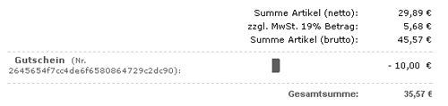 Der 10 Gutschein für die Newsletteranmeldung ist individualisiert, kommt aber sofort nachdem man seinen Aktivierungslink angeklickt hat. Bei mir sah er so aus: 2645654f7cc4de6f6580864729c2dc90.
