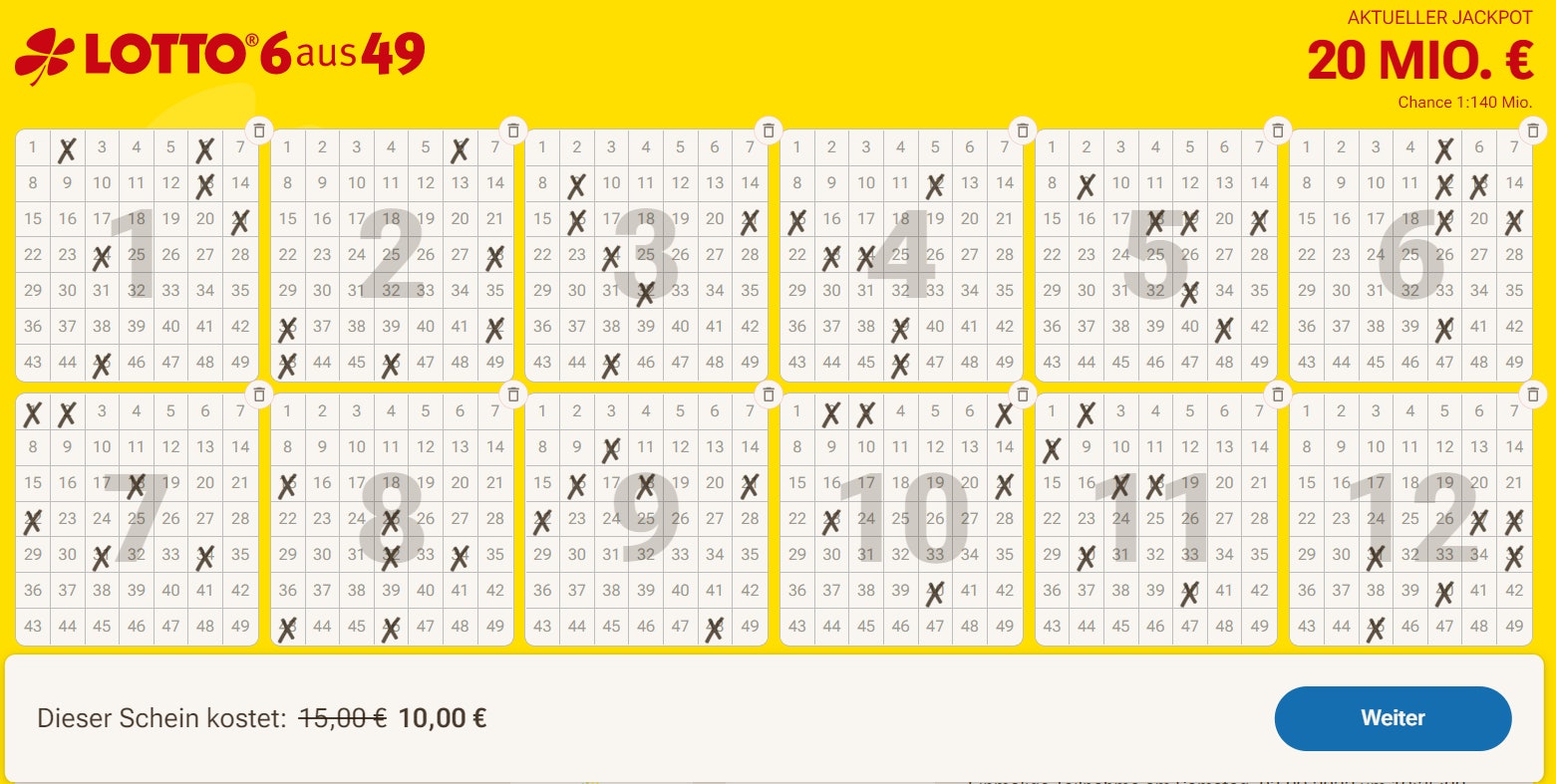 - Lotto 6aus49 mit 12 Feldern für 10€ (sonst: 15€)