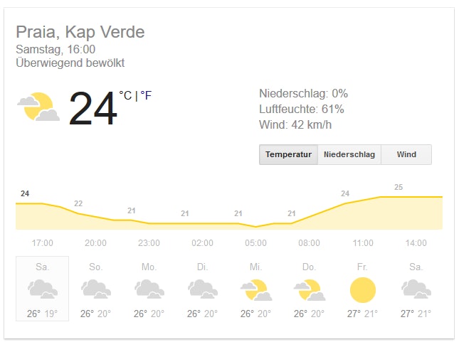 Die günstigsten Preise ergeben sich von Hannover, Frankfurt und Stuttgart aus in noch diesem Monat. Der Flug geht dann nach Boa Vista oder Sal. Die 185€ gelten nur für Hannover, für die beiden anderen Städte fallen 10€ mehr an. Das aktuelle Wetter auf den Inseln liegt übrigens bei 26-27°C – fast wie in Berlin momentan. 😉