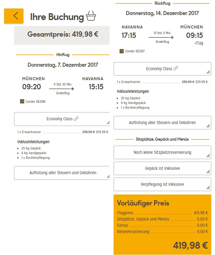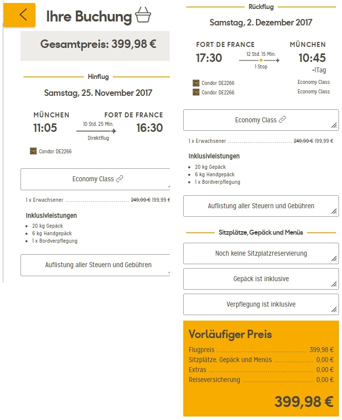 Am günstigsten bucht ihr über die Condor-Buchungsseite. Etwas teurer geht es übe die Momondo-Site. Leider kann ich die Suche bei Condor nicht verlinken, deshalb findet ihr ein paar Momondo-Suchergebnisse für die Flüge.