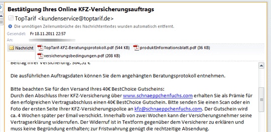 - KFZ-Versicherung über Schnäppchenfuchs bei Toptarif abschließen und 40€ BestChoice eShop-Gutschein als Prämie bekommen – siehe Hinweis in der Bestätigungsmail (Screenshot)