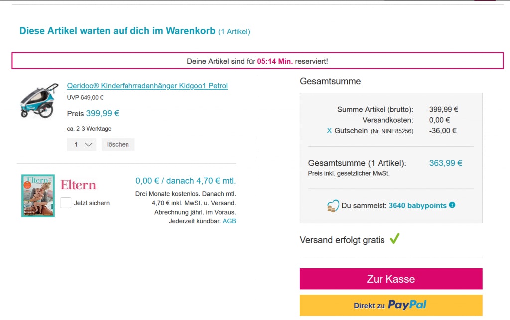 Hier seht ihr noch einen Screenshot vom angewandten Gutscheincode im Warenkorb: