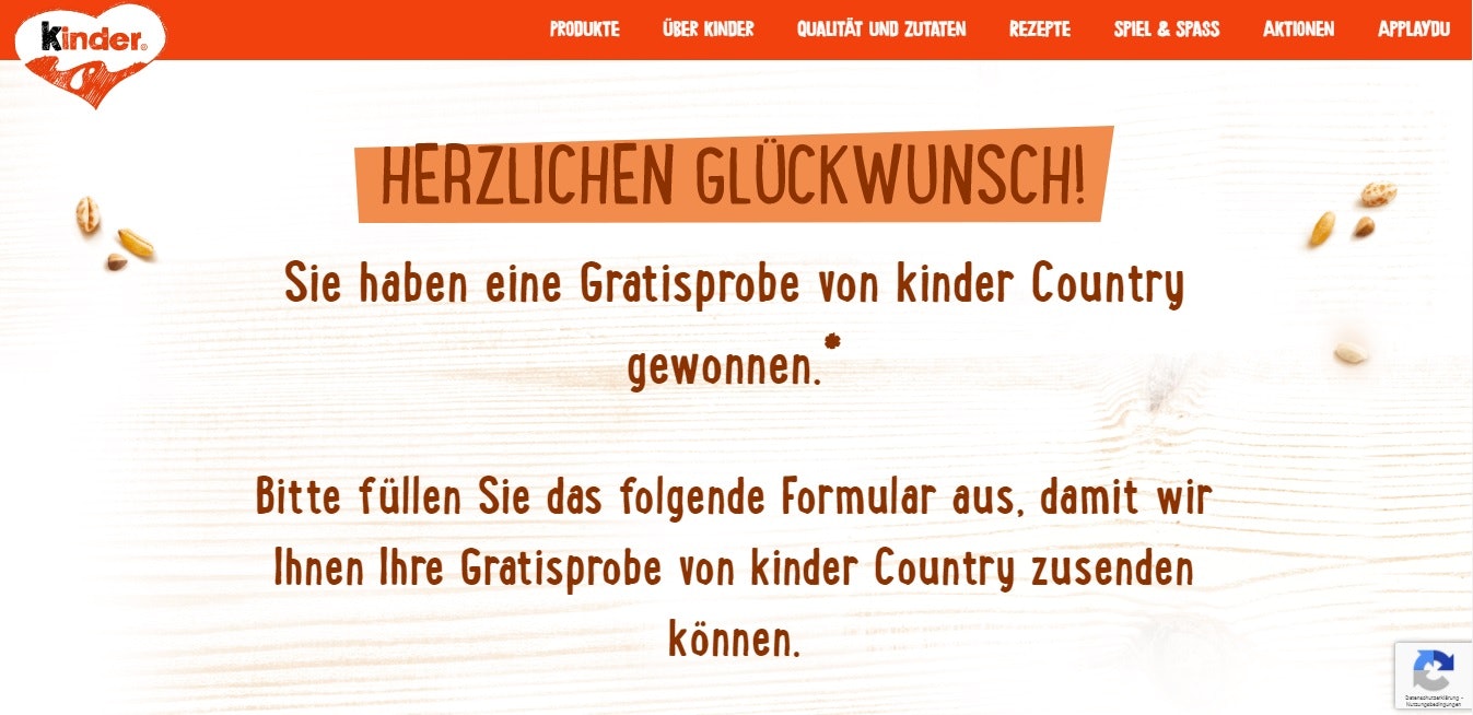 Ihr wollt so eine verlockende Gratisprobe von Kinder in eurem Briefkasten haben? Dann geht einfach auf Kinder.com und klickt euch zum Gewinnspiel. Wenn ihr auf „Los geht’s“ klickt, erfahrt ihr sofort, ob ihr eine der 1000 Gratisproben gewonnen habt. Das sieht dann folgendermaßen aus (Jaaa, ich habe tatsächlich eine Probe gewonnen):