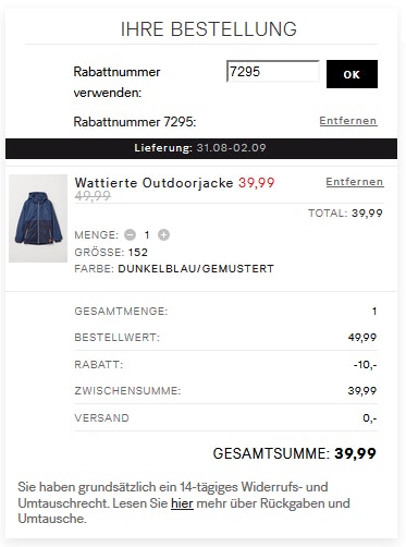 Hier seht ihr noch, wie der Gutscheincode euren Warenkorb vergünstigt und die Versandkosten streicht: