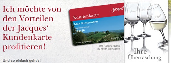 Zitat website "Als neuem Kartenkunden möchten wir Ihnen ein Vierer-Set der Jacques' Probiergläser schenken. Nach Erhalt der Kundenkarte können Sie es in Ihrem Depot abholen."