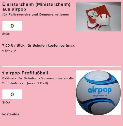 Nur an Schuladressen könnt ihr neben dem Profifußball, auch weiteres Infomaterial sowie eine Nachfüllpackung EPS-Gries für Experimentierkästen und ein Eiersturzhelm bestellen.