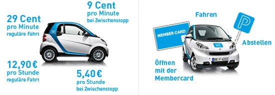 car2go ist im Grunde genau dasselbe wie DriveNow, nur dass es nicht von BMW & Sixt, sondern von Mercedes & Europcar stammt. So kurvt man dann auch mit kleinen Smarts statt mit BMW Minis durch die Stadt. Dass man dafür aber dieselben 29 Cent pro Minute zahlen soll, finde ich schon allerhand Ich habe DriveNow in den letzten Tagen mehrfach genutzt und finde es absolut genial (einfach ein Auto vom Straßenrand nehmen und losfahren – Parken ist kostenlos im ganzen Stadtgebiet). Viele haben berichtet, dass man auf Dauer beide Mitgliedschaften braucht, weil es zu oft vorkommt, dass kein DriveNow Auto in der Nähe ist. Im Zweifel ist DriveNow aber immer vorzuziehen, denn so ein Mini hat einen guten Zug drauf, während ein Smart sich echt Mühe geben muss, in die Hufen zu kommen.