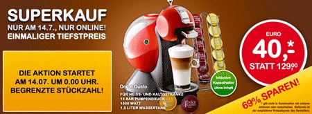 Interspar.at kennen wir von der verrückten 28%-Rabattaktion. Der österreichische Shop, der auch nach Deutschland liefert, hat ab 0 Uhr ein richtig gutes Angebot für den Start in eine kostspielige Dolce Gusto Karriere. Heute um Mitternacht geht’s los und wer eine Maschine haben will, sollte so lange wach bleiben: