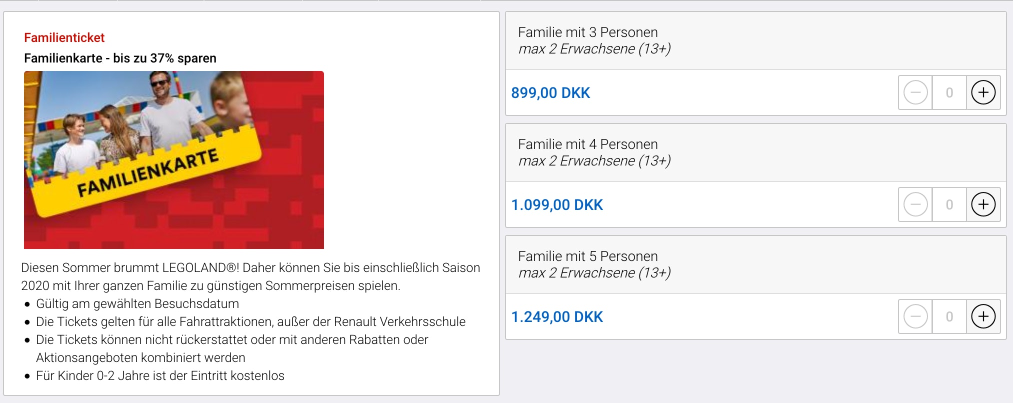 Bei Groupon stehen euch verschiedene Tickets zur Auswahl. Dabei handelt es sich immer um Familien-Angebote für zwei Erwachsene mit bis zu drei Kindern. Bis zum 1. November habt ihr Zeit, eure Eintrittskarten im Legoland Billund einzulösen. Achtung: Die Tickets sind wirklich nur in Billund gültig und können nicht im Legoland Deutschland eingelöst werden. Wer aber ohnehin einen kleinen Abstecher Richtung Norden mit den Kids machen wollte, kann diesen günstigen Deal mit nach Dänemark nehmen. Vor Ort zahlt ihr nämlich deutlich mehr, wie ihr hier seht: