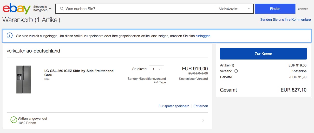 Manchmal zählt Größe eben doch: Opulente 591 Liter Nutzinhalt hält der Side-by-Side-Monster von LG hinter seinen Türen in Edelstahlästhetik bereit, weshalb ihr euch für die nächste Party inklusive Katersonntag bestens wappnen könnt. Crushed Ice, Kaltwasser und alle Luxuriösitäten dieser Art hat das Gerät natürlich auch an Bord und dank NoFrost war mühseliges Abtauen gestern. Mit einer Energieeffizienzklassierung von A++ muss sich der voluminöse Kühlriese auch hinsichtlich laufender Kosten nichts vorwerfen lassen. Bei 16 Amazon-Bewertungen kommt das Gerät auf 4,3 von 5 Sterne. Den Preisnachlass bekommt ihr erst, nachdem ihr das Teil in den virtuellen Warenkorb auf eBay verfrachtet habt.