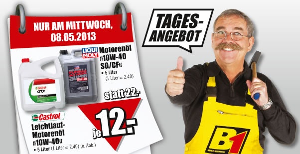 Wollt ihr eurem lieben Gefährt mal wieder etwas gutes tun und ist der Ölstand wieder länger nicht überprüft worden, dann schaut doch am besten direkt mal nach. Denn nur heute gibt es hochwertiges Motoröl von Liqui Moly und Castrol im Angebot bei B1 Discount, mit dem ihr den Motor wieder gut flutschen lassen könnt: