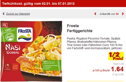 - Frosta Tiefkühlgerichte, verschiedene Sorten, für 1,64 pro Packung (regulärer Preis bei allen normalen Supermärkten (Edeka, Rewe,..): 3,29 – manchmal für 2,79 im Angebot)