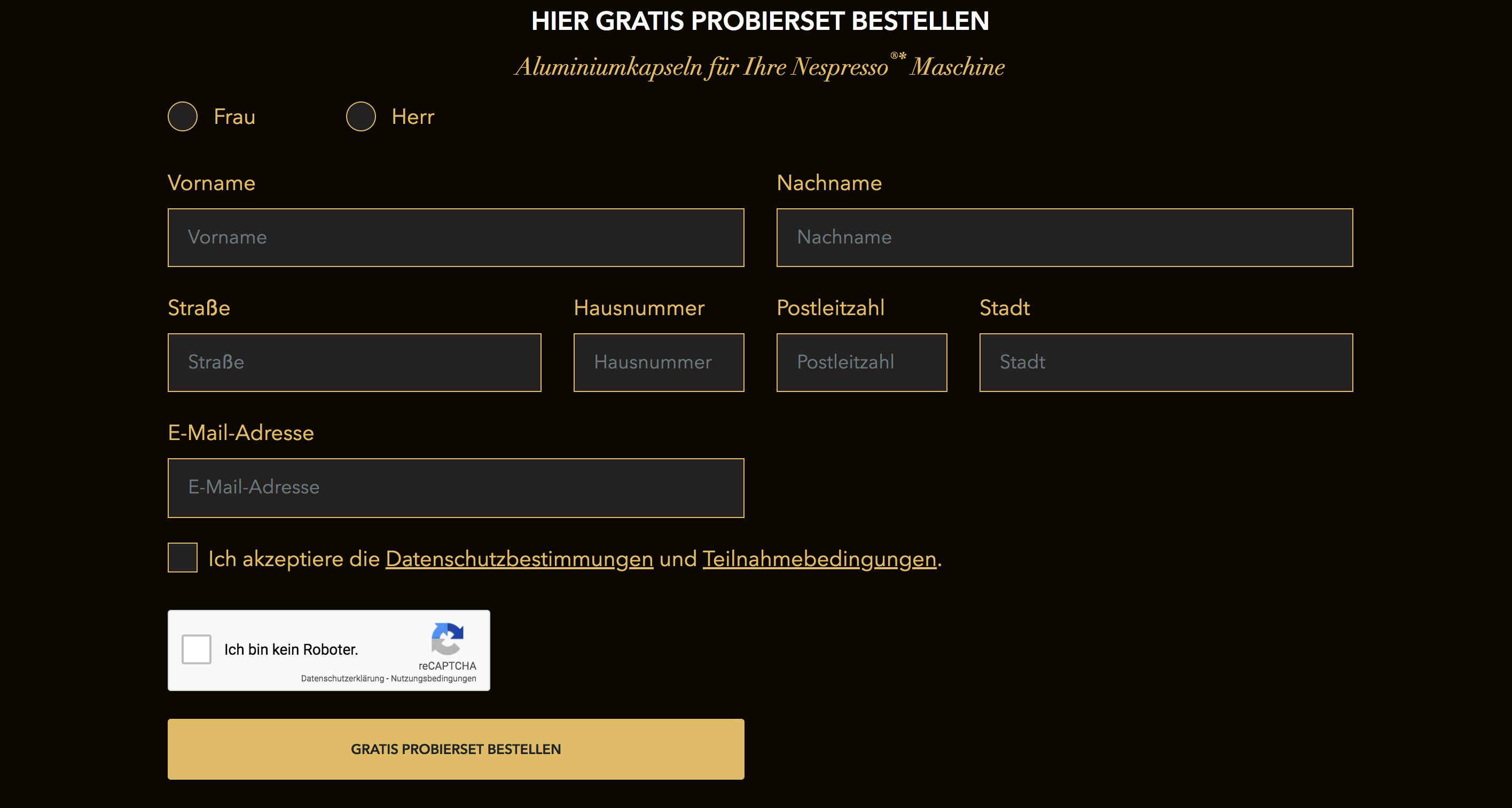 Schreiben Kommentar schreibenVerkaufe mir, für vier mit 0815 Kaffee befüllten Kapseln, deine Daten. Weitere Prospekte und dubiose Anrufe mit eingeschlossen.