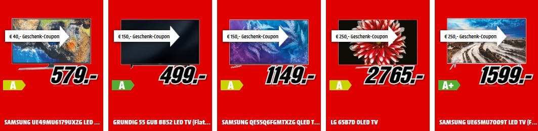 Kommen wir jetzt zu den Schnäppchen – und natürlich hat man sich in dem Prospekt vor allem auf die Kategorien gestürzt, bei denen die Aktion gilt. Soll heißen: Fernseher, Beamer, Kaffeevollautomaten, Waschmaschinen, Kühlschränke und mehr. Wir haben die Schnäppchen mal in zwei Kategorien unterteilt. Zum einen in die, bei denen ihr schon beim ersten Einkauf ein Schnäppchen macht – und zum anderen in die, die erst durch den Coupon für den nächsten Einkauf so richtig interessant werden.