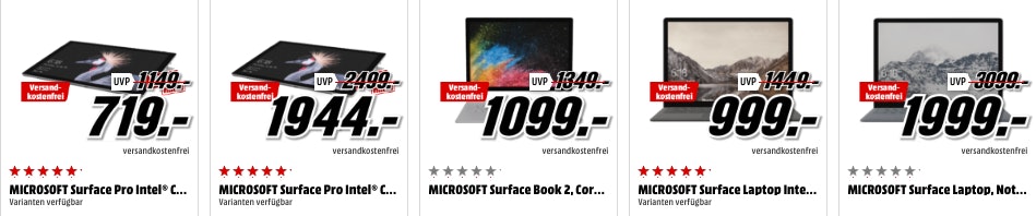 - Microsoft Surface 14″ Laptop (i5-7200U, 8 GB RAM; 256 GB SSD) für 999€ inkl. Versand (Preisvergleich: 1.255€)
