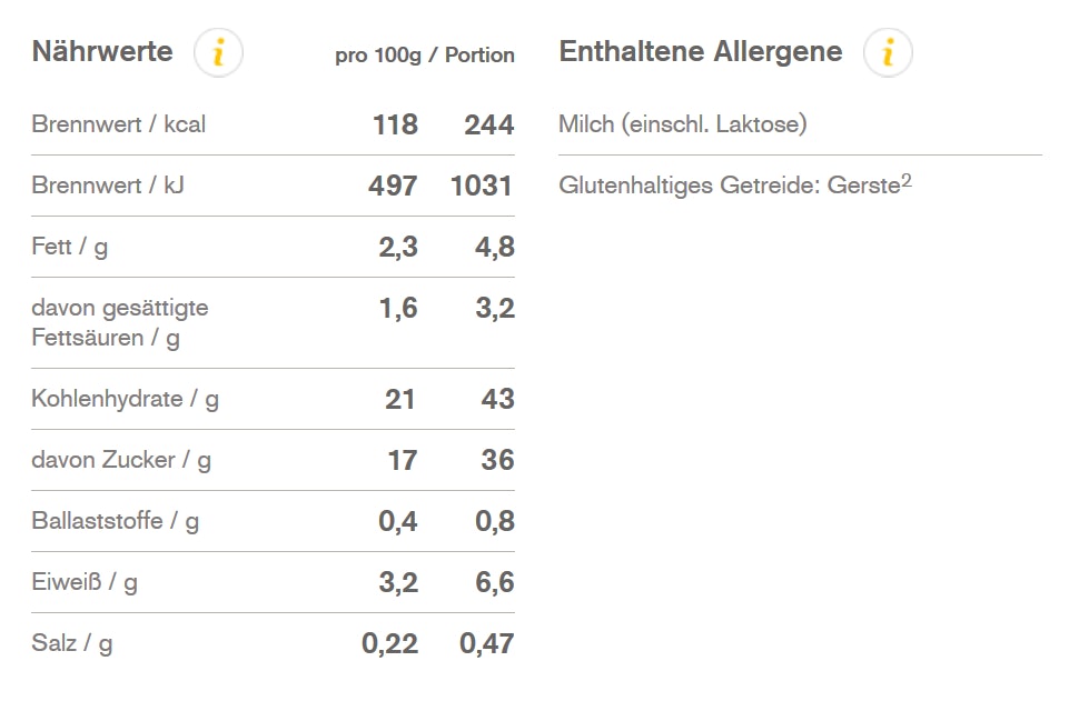 Wer wissen möchte, wie viel Zucker und Kalorien in dem süßen Drink stecken, kann noch einen kurzen Blick auf die Nährwerte werfen, hier mal am Beispiel des Schoko-Shake: