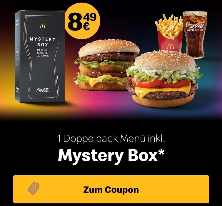 Ihr erhalter somit zu eurer Mystery Box ein Doppelpack Menü mit 1 Big Mac, 1 Hamburger Royal TS, 1 große Pommes sowie 1 Getränk und bezahlt lediglich 8,49€. Klingt doch verlockend, oder? 😋