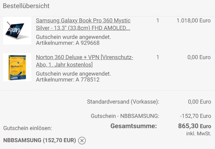 - Samsung Galaxy Book Pro 360 (13,3″) für 865,30€ inkl. Versand (Preisvergleich: 999€) – mit Gutscheincode: NBBSAMSUNG