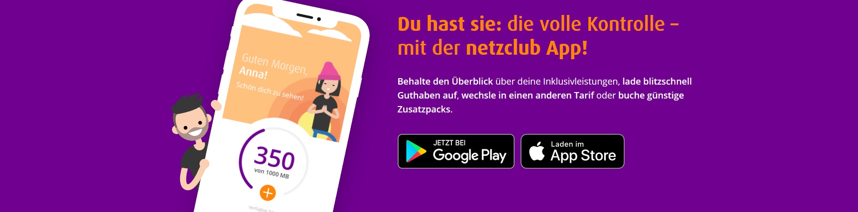 Natürlich könnt ihr euren Tarif individuell anpassen und (gegen Bares 😉 ) aufstocken. Ihr könnt zum Beispiel Guthaben aufladen, welches ihr dann für SMS oder zum Telefonieren verwenden könnt. Welche Optionen ihr habt und wie viel euch diese kosten, könnt ihr in eurem Account einsehen oder bequem in der kostenlosen Netzclub-App überprüfen. Außerdem könnt ihr dort günstige Zusatzpacks, wie zum Beispiel Flats oder zusätzliches Datenvolumen buchen, wenn euch der Basic Tarif zu dünn ausgestattet sein sollte.