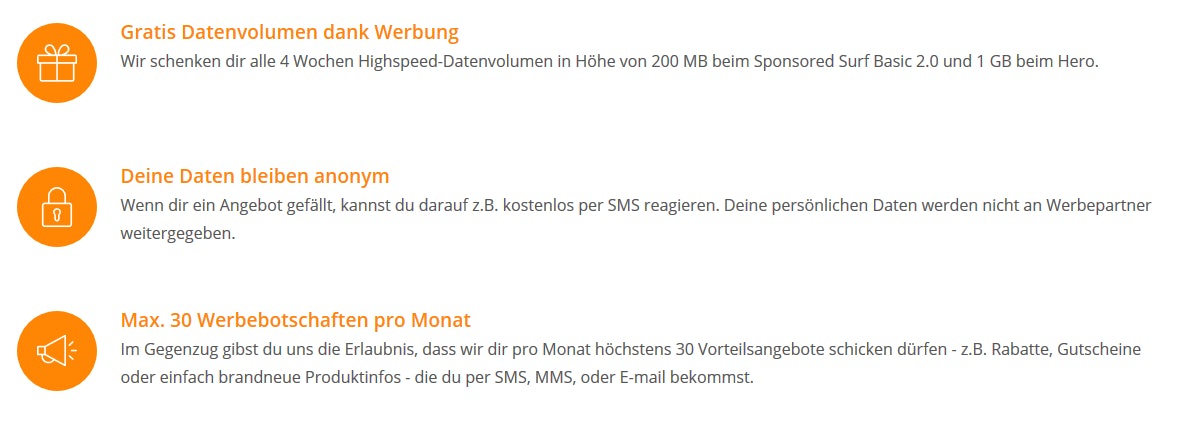 Eine Rechnung können wir uns an dieser Stelle ausnahmsweise mal komplett sparen, denn es fallen für euch keinerlei Kosten an. Es gibt keine Anschlussgebühr und keine monatliche Grundgebühr, ihr zahlt lediglich, wenn ihr SMS schreibt oder telefoniert. Inklusive sind 200MB LTE. Damit sich das Ganze für den Anbieter rechnet und man euch kostenloses Datenvolumen zur Verfügung stellen kann, wird der Tarif über Werbung finanziert. Will heißen: Ihr bekommt ab und an eine Werbe-SMS oder -Mail. Maximal 30 Angebote werden euch monatlich geschickt, was einer Werbeanzeige pro Tag entspricht. Diese könnt ihr einfach wegklicken und das war’s 😉 Das Datenvolumen behaltet ihr auch dann, wenn ihr die Werbung ignoriert, ihr müsst nicht (wie es früher der Fall war) auf die Werbe-SMS reagieren.
