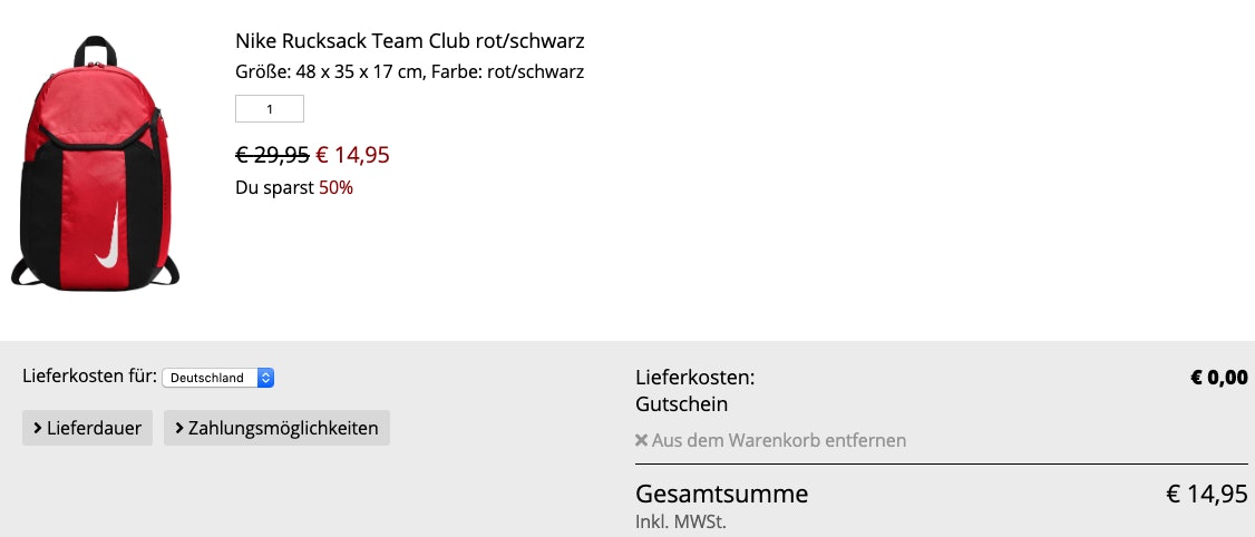 Aus über 100 Bewertungen kommt der Nike-Rucksack auf 4,7 von 5 Sternen. Bei diesem Angebot spart ihr mit dem Gutscheincode tc-bag die Versandkosten.