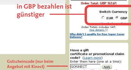 Der Gutscheincode wird ebenfalls dort eingeben. Achtet auch darauf, den Amazon Currency Converter auszuschalten und in GBP zu bezahlen. Der Wechselkurs Eurer Kreditkarte ist besser, und die 1-2% Kreditkartengebühren habe ich in die Endpreise eingerechnet (habe mit 1,75 % gerechnet – das ist der Satz der DKB).