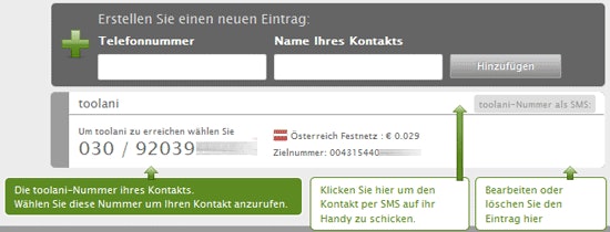 Die Sache läuft so: für jeden seiner Auslandskontakte bekommt man von toolani.de eine deutsche Festnetzrufnummer. Wenn man nun dort anruft, wird man automatisch weiterverbunden. Dabei berechnet toolani dann einen festen Preis, der vom Guthaben abgezogen wird. Besonders cool an dieser Lösung ist eben, dass man anders als bei Skype keinen PC braucht, sondern die feste Nummer als Kontakt einspeichern kann. Guthaben kriegt man über Paypal, Sofortüberweisung oder Überweisung.