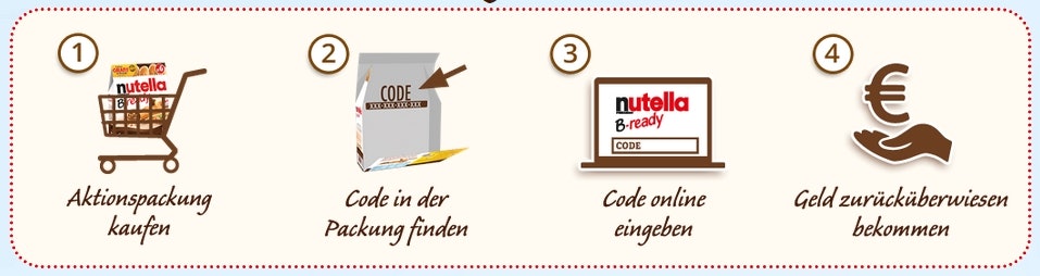 Kauf euch einfach eine Aktionspackung von Nutella b-ready, findet den Aktionscode auf der Innenseite der Packung, folgt dem Deallink und füllt das entsprechende Formular mit dem Code aus. Jetzt seid ihr für die Aktion registriert und erhaltet den vollen Kaufpreis innerhalb von zwei Wochen als Überweisung zurückerstattet. Gratis Nutella-Produkte futtern leicht gemacht!