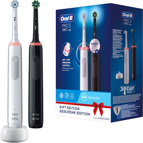 Endlich wieder unter 50€! Und dann gleich zwei elektrische Zahnbürsten von Oral B (also Braun). Das Doppelpack Oral B Pro 3 3900, einmal in schwarz und einmal in weiß, gibt es heute als Amazon Prime Angebot für 48,99€ inklusive Versand.
