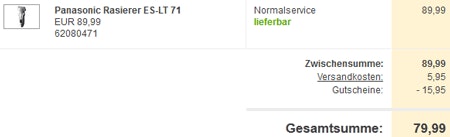 - Panasonic ES-LT71 für 79,99 inkl. Versand mit 15,95 Neukundengutschein: „60023“ (Preisvergleich: 114)