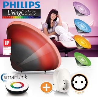 Hier gibt es den LivingWhites Adapter gratis dazu. Damit kann man normale, dimmbare Lampen in das Living Colors Netzwerk einbinden und über die SmartLink Fernbedienung steuern. So kann man etwa eine Living Colors als Stimmungsleuchte und zum Ausgang des Raumes noch eine normale Lampe (muss dimmbar sein) über die LivingWhites einbinden. Drückt man nun auf der SmartLink Fernbedienung auf Aus, dimmen beide Lampen gleichzeitig langsam runter.
