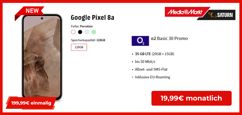 - Google Pixel 8 für einmalig 9,95€ im 25GB o2-Tarif für 29,99€/Monat bei sparhandy.de