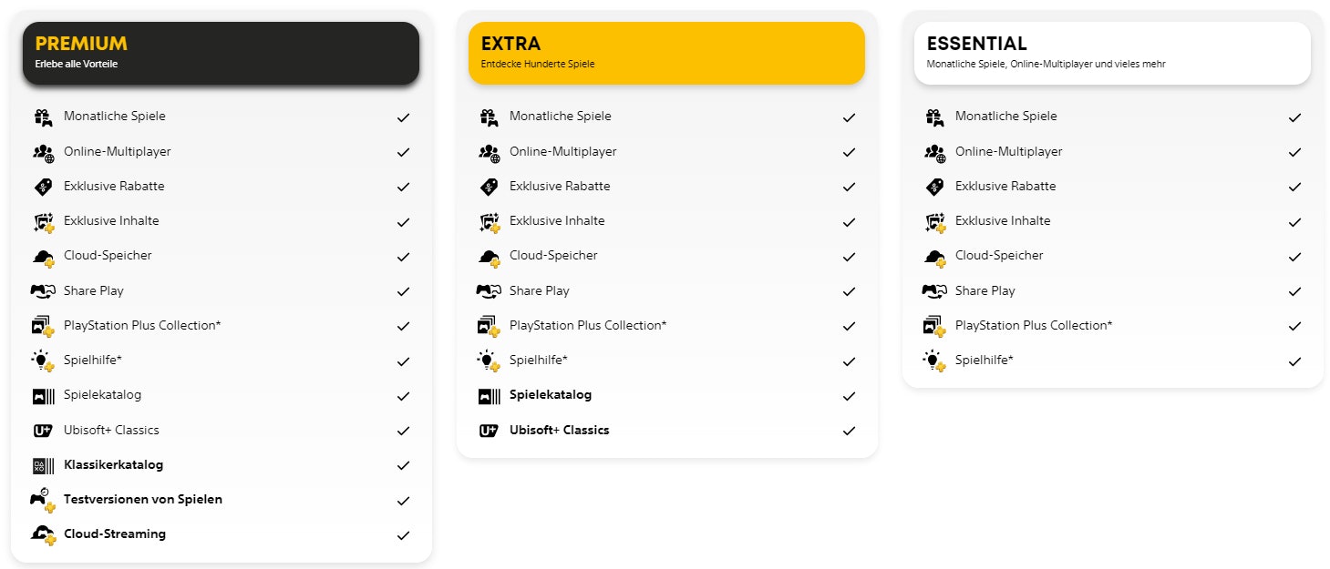 Wer nicht immer nur wie der einsame Wolf durch die spannendsten Pixelgalaxien der Gegenwart reisen, sondern das virtuelle Gefecht auch gerne gemeinsam mit seinen Freunden und Freundinnen bestreiten möchte, braucht das PlayStation Plus-Abonnement. Im Abo winken euch als Premium-Mitglied außerdem bessere Preise für Sale-Games und exklusive Zugänge zu Demo- oder Betaversionen. Obendrauf gibt’s Monat für Monat Freebies für eure Konsole. Die wichtigsten Eckdaten zu den Plus-Vorzügen könnt ihr auch noch einmal direkt auf der PS Plus Infoseite nachlesen. Mittlerweile teilen sich die Playstation Plus-Privilegien in drei unterschiedliche Abo-Modelle und Preisklassen auf: Essential, Extra und Premium.