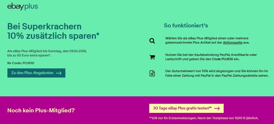 - Der Gutschein „PLUS10“ gilt nur für eBay Plus-Mitglieder. Neumitglieder können eBay Plus 30 Tage kostenlos testen. Das Angebot einer kostenlosen Probephase kann pro Person lediglich einmal wahrgenommen werden.
