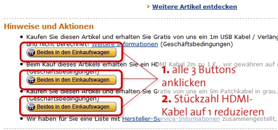 Dazu klickt man auf der Artikelseite nacheinander auf die drei Buttons „Beides in den Einkaufswagen“. Zwischendurch muss man immer die Zurück-Taste des Browsers benutzen. Im Warenkorb ändert man noch die Stückzahl des 1,5m HDMI-Kabels auf 1. Die Warenkorbsumme ist dann 14,14 .