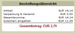 Durchklicken bis zum letzten Bestellschritt ergibt folgendes Bild. Also kriegt man 4 Kabel, die man bestimmt irgendwann mal brauchen kann, für 2,79 (das USB-Kabel ist übrigens ein Verlängerungskabel – Foto).