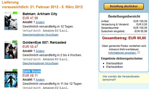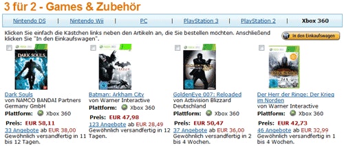 Für die Xbox würde man so zum Beispiel Batman: Arkham City, GoldenEye 007 und Dark Souls für 60,60 bekommen (Idealopreise: 33 + 37 + 40 = 120).