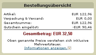 Im letzten Bestellschritt werden jetzt 90,46 Rabatt abgezogen, sodass man auf einen Endpreis von 32,50 kommt.