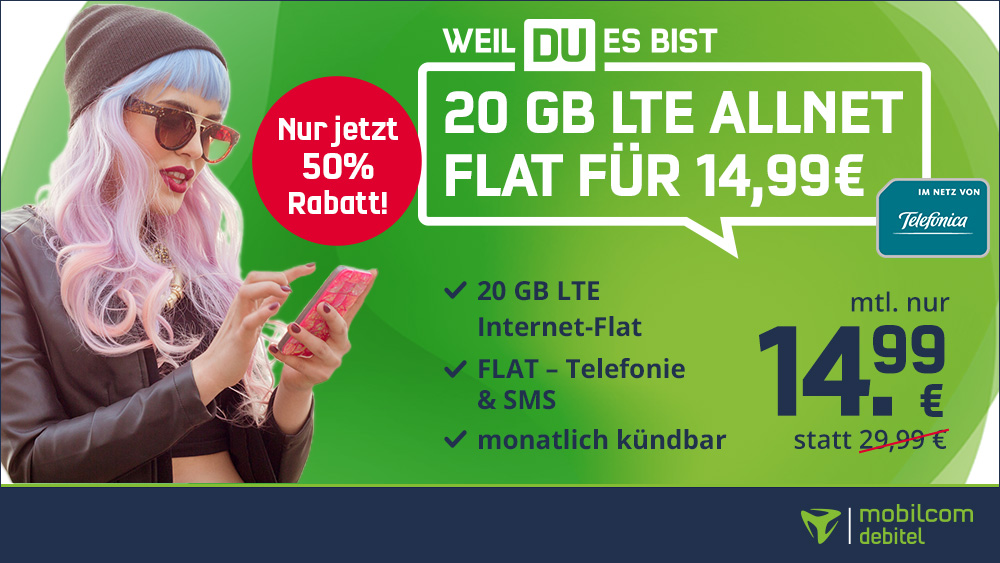 - Internet: 7GB LTE mit bis zu 50 Mbit/s (danach abwählbare Datenautomatik)