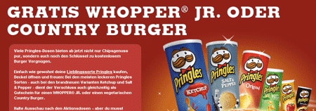 Gesund trifft sehr gesund: in jeder neuen Pringles Aktionspackung findet man einen Gutschein für einen Burger King Junior Whopper. Erhältlich sind die Aktionspackungen in vielen Läden wie Penny oder Kaufland, achtet aber auf den entsprechenden Hinweis auf der Packung. Der Gutschein ist dann im Deckel.