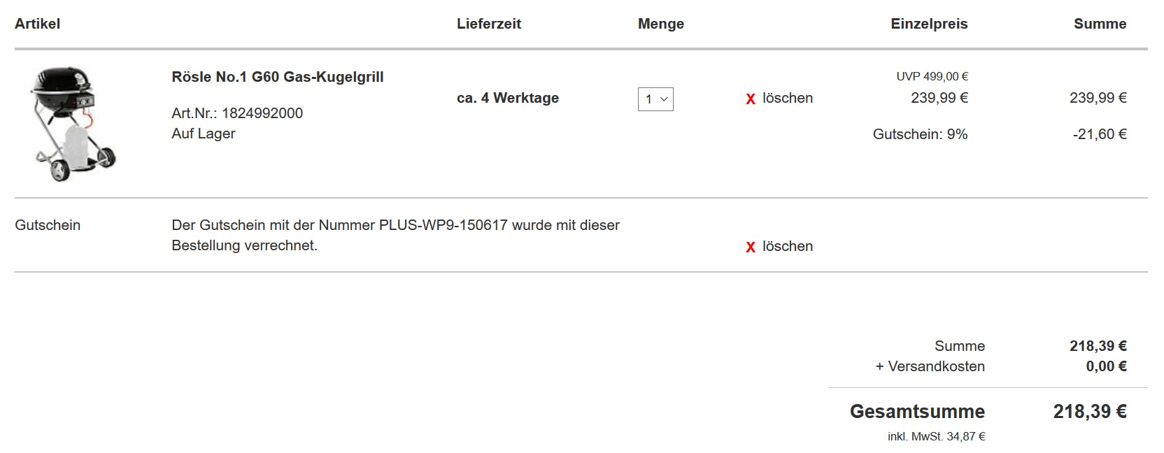 Der Rösle No.1 G60 ist heute wieder als Plus des Tages zu haben. Zusätzlich könnt ihr auf den bereits reduzierten Preis noch einmal 9% sparen, wenn ihr den passenden Gutscheincode eingibt. Wer also noch BBQ-Equipment für den Sommer braucht, wird hier fündig.