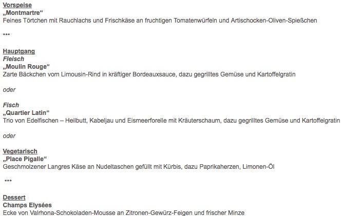 Beim Varieté habt ihr auch die Möglichkeit, eine Show inklusive 3-Gänge-Menü zu buchen. Diese Option nennt sich dann „& Dine“. Hier mal das Menü der Paris-Show: