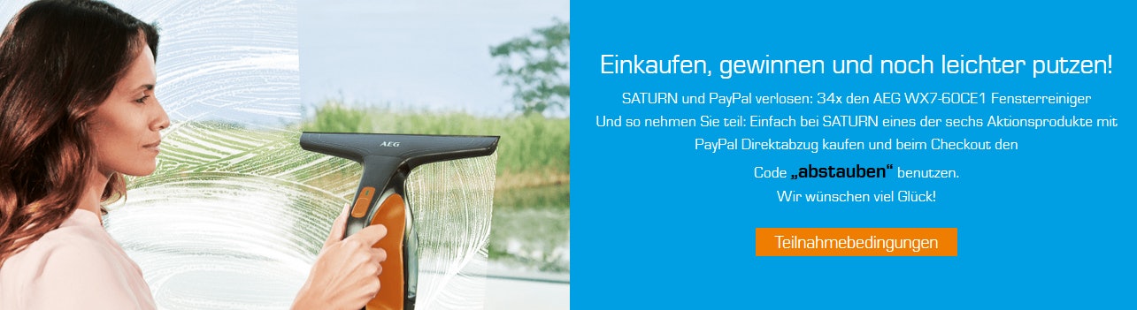 Saturn möchte euch dezent darauf hinweisen, dass ihr zum Frühjahrsbeginn doch mal die Bude putzen könntet. Dazu gibt es aktuell 20% Rabatt auf ausgewählte Aktionsprodukte, wenn ihr mit PayPal zahlt. Mit dabei sind Artikel aus dem Bereich Haushalt, wie zum Beispiel Staubsauger oder Bügeleisen. Zusätzlich habt ihr die Chance, einen von 34 AEG Fensterreinigern zu gewinnen.