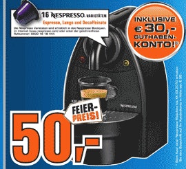 Und auch hier wieder. Wenn jemand noch einen 70€ Gutschein von eBay für Nespresso hat, bekommt für die manuelle Serie 50€ zurück, d.h. die Maschine quasi gratis! Müsste man nur noch in Köln wohnen. Gibts die letzten Tage der Cashback Aktion nicht noch andere Nespressoangebote??