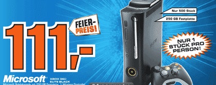 - Xbox 360 Elite 250 GB (refurbished) für 111 (Preisvergleich: 225) – laut Saturn Köln-Weiden sind noch ein paar da, aber nicht mehr lange – ist die alte Xbox