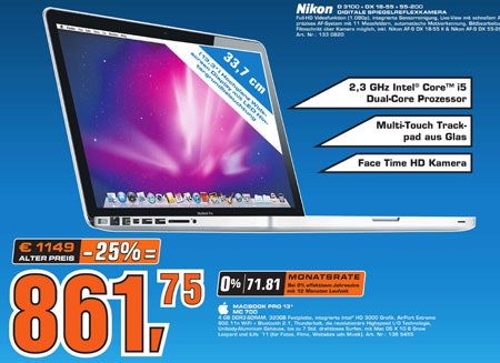 - Alle Münchner Saturn Märkte: Apple MacBook Pro 13,3″ (Early 2011, MC700) für 861,75 (Preisvergleich: 1005) – Link zum Prospekt (PDF)