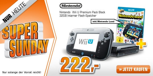 - Nintendo Wii U Premium Pack mit 32GB und Nintendo Land für 222 (Preisvergleich: 292) – das ist ein super Preis für das Premium Pack, ihr solltet schleunigst zugreifen – bei Amazon bekommt die Konsole 4 von 5 Sternen – im Premium Pack bekommt ihr 32GB und Nintendo Land