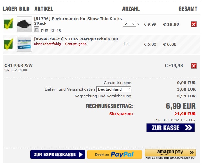 Anbei noch ein Screenshot aus dem Warenkorb, damit ihr uns auch glaubt, dass die Bestellung tatsächlich mit dem Gutschein funktioniert: