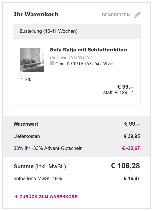 - Schlafsofa Katja für 106,28€ inkl. Versand bei Mömax.de (sonst: 129€)